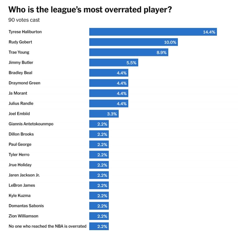 在谁是联盟中最被高估的球员的话题(90人投票)中,哈利伯顿得票最多,达到了14.4%(13人),戈贝尔和特雷-杨分列二三位,恩比德、字母哥、乔治、詹姆斯和锡安等多位球星上榜。